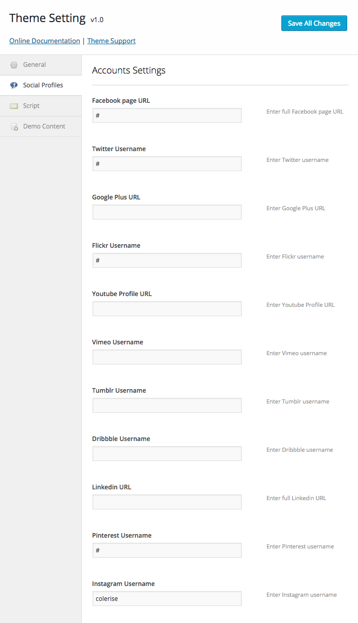 Theme Setting > Social Profiles for all social media options